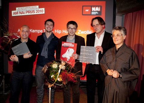 Concrete'in ortakları Rob Wagemans ve Erikjan Vermeulen ile Atelier Kempe Thill'in sahipleri Andre Kempe ve Oliver Thill, ödüllerini Jüri Başkanı Nasrine Seraji'nin elinden aldılar. (Foto: Fred Ernst) 40 yaş altı genç mimarları teşvik etmek, çalışmalarını duyurmak ve tanınırlılıklarını artırmak amacıyla, Hollanda Mimarlık Enstitüsü (NAI) ve AM gayrimenkul şirketi tarafından, "En İyi Tasarım/Yapı" dalında iki yılda bir düzenlenen AM NAI Ödülü'nün 2010 yılı kazananları belli oldu. Hollanda mimarlığının nabzını ölçme aracı olarak da değerlendirilen AM NAI Ödülü'nü, ilk olarak 2002 yılında Lahey kentindeki Haageneiland projesi ile MVRDV, 2004 yılında Utrecht’te yer alan basketBAR projesi ile NL Architects, 2006 yılında Middelburg’da yer alan Bridge House (Köprü ev) Projesi ile BAR Architects ve son olarak 2008 yılında Villa 1 projesi ile Powerhouse Company kazanmıştı.