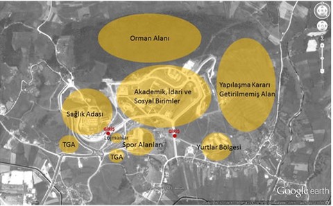 Ayrıca yerleşke sınırları dahilinde fakat bağımsız Teknoloji Geliştirme Alanları (TGA) da güney ve güneybatıda bulunmaktadır. Yarışmaya konu alan j.mp/duzceuniversitesi adresinden de görülebilir.