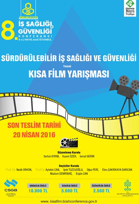 8-11 Mayıs tarihlerinde İstanbul’da düzenlenecek 8. Uluslararası İş Sağlığı ve Güvenliği Konferansı öncesi sonuçların belli olacağı kısa film yarışmasının jürisinde ise Prof. Dr. Nezih Orhon, Prof. Dr. Aytekin Can, Oyuncu İpek Tuzcuoğlu, Yapımcı Oğuz Peri, Yönetmen Ebru Çakırkaya Sarıcan, Görüntü Yönetmeni Mazlum Demirbağ, Çalışma ve Sosyal Güvenlik Bakanlığı Eğitim, Tanıtım ve Organizasyon Daire Başkanı Ergün Can yer alıyor. Yarışmada birinci olan esere 10 bin lira, ikinci esere 5 bin lira, üçüncü olan esere ise 2 bin 500 lira para ödülü verilecek. Ödül töreni ise Konferans sırasında gerçekleştirilecek.