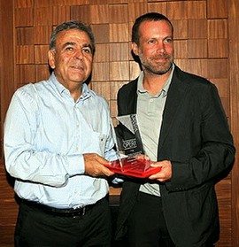 ödülünü Başkan Aziz Kocaoğlu verirken, ikinci olan Hakkı Can Özkan-Dilek Derman,