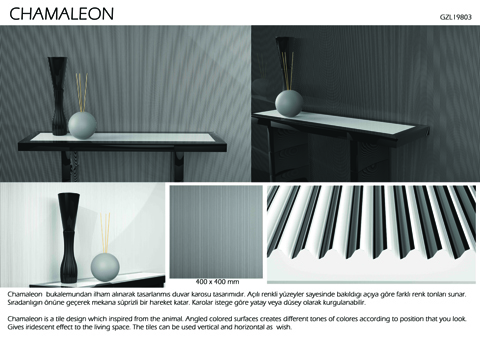 Mekanlara sürprizli hareket katan tasarım Bu yıl üçüncü kez yapılan ve ilk kez XONE adıyla düzenlenen XONE Seramik Tasarım Yarışması ‘Seramik Kaplama Malzemeleri Kategorisi’nin birincisi, Deniz Demirkanlı’nın bukalemundan ilham alarak tasarladığı ‘Chamaleon’ adlı projesi seçildi. Açılı renkli yüzeyler sayesinde, bakıldığı açıya göre farklı renk tonları sunan ‘Chamaleon’, mekana sürprizli bir hareket katan tasarımıyla dikkat çekiyor.