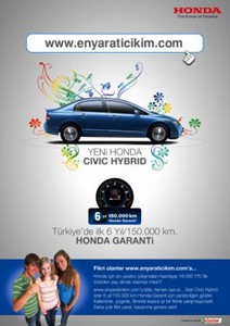 Honda “En Yaratıcı Kim?” yarışmasında öğrencilere, Honda Civic Hybrid veya 6 yıl/150.000 km. Honda Garanti konularında yaratıcılıklarını gösterme fırsatı sunuyor. Proje Dökümanı, Görsel ve Video kategorilerinde düzenlenen yarışmaya katılımcılar akıllarına gelen ilginç fikirleri paylaşarak, bir ilan, poster, web sitesi tasarlayarak veya bir el kamerası hatta bir cep telefonu ile video hazırlayarak yarışmaya katılabilecekler.