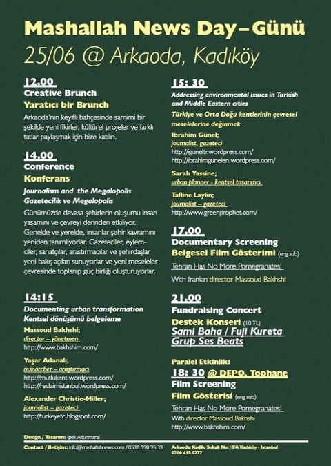 Arkaoda, özel bir güne hazırlanıyor: 'Mashallah News' Günü. Programda yer alan aktiviteler arasında, 'Gazetecilik ve Megapolis' konusunda bir konferans ve İranlı yönetmen Massoud Bakhshi’nin de katılacağı 'Tehran Has No More Pomegranates' adlı filmin gösterimi bulunuyor.