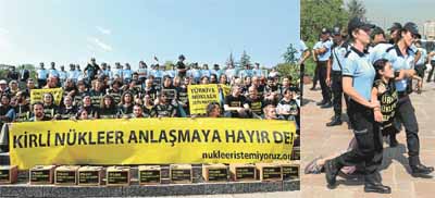 Nükleer santralla ilgili anlaşmanın Meclis’te görüşülmesine bir hafta kala, çevreciler nükleer santrala karşı Türkiye çapında topladıkları 170 bin imzayla TBMM’nin önüne geldi. Nükleer santral istemiyoruz’, ‘Kirli nükleer anlaşmaya hayır’ ve ‘Türkiye nükleer istemiyor’ yazılı pankart açan grup ‘Dağılın’ uyarısına uymayınca, güvenlik güçleri