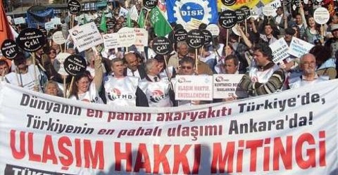 Ankara'da sol partiler, sendikalar ve meslek örgütlernin çağrısıyla buluşan yaklaşık 3 bin kişi Büyükşehir belediyesinin toplu ulaşıma yaptığı zamları protesto etmek için yürüdü. Ulaşım Hakkı Ortak Mücadele Grubu'nun düzenlediği mitingde "Dünyanın en pahalı akaryakıtı Türkiye'de, Türkiye'nin en pahalı ulaşımı Ankara'da" yazılı pankart taşındı.