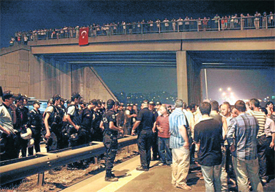 Köprü üzerinde toplanan kadınlı erkekli yüzlerce kişi,