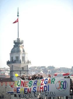 pankartı açan grup, Kızkulesi önünde de "İş, iklim, adalet" şeklinde slogan