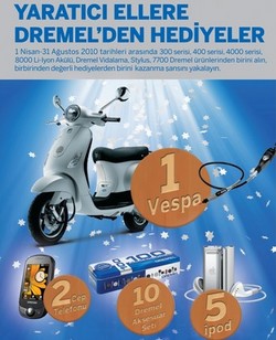 Ahşap işleri, maket yapımı, araba restorasyonu, takı yapımı gibi kişisel yaratıcılık gerektiren projelerle ilgilenenlerin tercihi Dremel, hobi meraklılarına hediyeler kazandırıyor. 31 Ağustos’ta sona erecek 'Dremel hediye kampanyası', 1 kişiyi Vespa, 5 kişiyi ipod shuffle 4 GB, 2 kişiyi Samsung Touch cep telefonu ve 10 kişiyi 100 parçalı Dremel