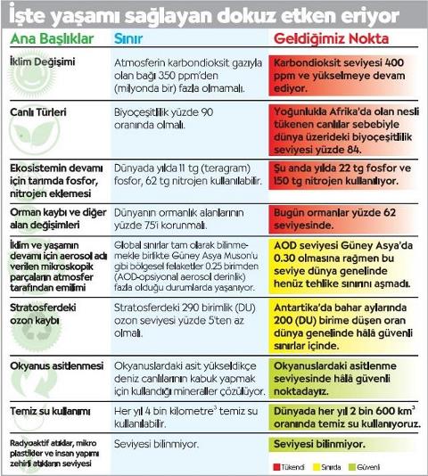 Cumhuriyet'in haberine göre, İsveç'teki Stockholm Direnç Merkezi uzmanı Profesör Johan Rockstrom, dünyada yaşamın devamlılığını sağlayan 9 ana etken olduğunu ve insanoğlunun modern yaşamla bunların 4’ünde sınırı aştığını belgeledi. Rockstrom, ekosisteme yüklenen aşırı nitrojen seviyesi, ormanlık alanlardaki büyük kayıp, hızlı iklim değişimleri ve nesli tükenen hayvanlar nedeniyle, ‘dünyanın artık insan oğluna dost değil düşman’ bir yer olduğunu söyledi. Rockstrom, hazırladığı tabloyla dünyanın yaşama uygun olması için gerekli olan etkenleri, bunların uygun sınırlarını ve 2015 yılında gelinen noktayı açıkladı.