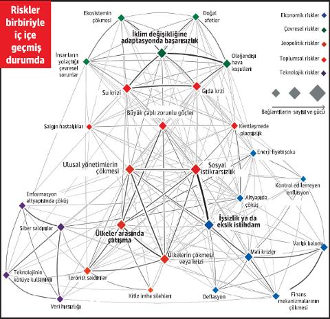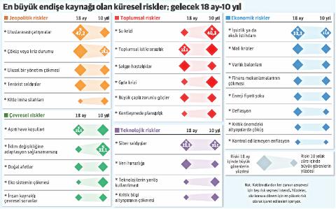 Dünya Gazetesi'nden Evrim Küçük'ün haberine göre, küresel gündemin tepesinde yıllarca ekonomik sorunlar başı çekti. Bu yıl ise 25 yıl önce Berlin Duvarı’nın yıkılmasından bu yana ilk kez uluslararası çatışmalar dünya için en büyük endişe kaynağı haline geldi. Dünyayı hem kısa vadede hem de gelecek 10 yıl içinde birçok risk bekliyor.