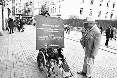 tekerlekli sandalyelerle sokağa çıktı. Ellerinde, “Bu bir şaka değildir. Kim