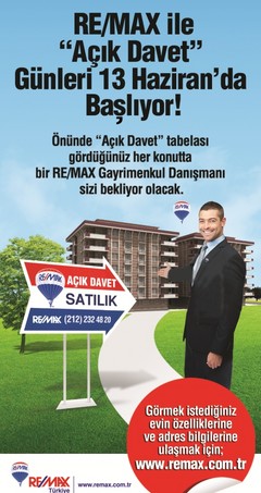 RE/MAX’in gayrimenkul profesyonelleri, artık her ayın ikinci Pazar günü, müşterilerini satışa sundukları portföyler arasından seçtikleri bir gayrimenkulde ağırlayacaklar. RE/MAX’in Kuzey Amerika ve dünyanın pek çok ülkesinde yıllardır başarıyla uyguladığı 'Açık Davet' organizasyonunu ülkemize taşıyan RE/MAX Türkiye, ilk uygulamayı 13 Haziran Pazar