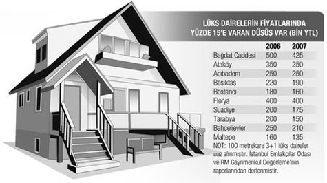 Her türlü konforu barındıran yeni yerleşim alanları, lüks semtlerde oturanlar tarafından doldurulmaya başlandı. Bu gelişme, merkezî semtlerdeki ikinci el daire piyasasında durgunluğa yol açarken, konut fiyatlarında yüzde 15'e varan düşüş gözleniyor. İstanbul'da Bağdat Caddesi'nde 2006'da 500 bin YTL'ye satılan ortalama lüks dairelerin fiyatları bu yıl 425 bin yeni liraya kadar geriledi.