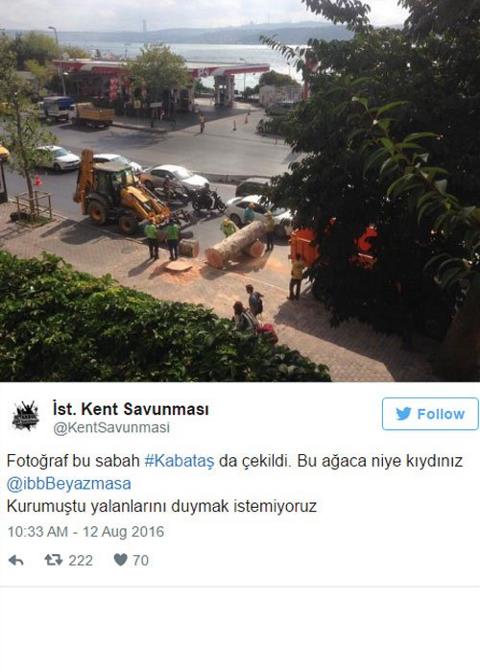 İstanbul Kent Savunması twitter hesabından sabah saatlerinde çekilen fotoğrafı paylaşarak İBB Beyaz Masa’ya “Bu ağaca niye kıydınız” diye sordu. İstanbul Kent Savunması, her ağaç kesiminde tekrarlanan “bahaneyi” duymamak için “Kurumuştu yalanlarını duymak istemiyoruz” dedi. |