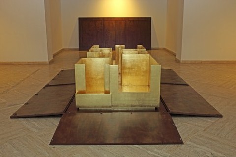 bellek kasası olarak varakla kaplanmış o evin ahşap maketini sergiliyor; aslında
