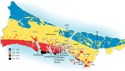 İstanbul'un zemin yapısı da haritada renklere göre belirlenmiş. Kırmızı renkli bölgeler zayıf zeminleri (alüvyon, dolgu alanları vb.), sarı renkli bölgeler de gevşek zeminleri gösteriyor. Yeşil renkli bölgeler ise kayalık alanları gösteriyor. Haritaya göre, Anadolu yakasının zemini Avrupa yakasına göre daha sağlam gözüküyor.