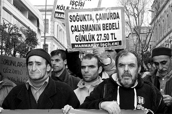 Marmaray Projesi’nin Yenikapı Şantiyesi’ndeki kazılarda çalışan işçiler çalışma şartlarının kötülüğünden yakınarak İstanbul Valiliği önünde eylem düzenledi. İstanbul Valisi Muammer Güler’den yardım isteyen işçiler adına konuşan Aydın Erhan, “Günde 27.5 TL’ye çalışırken maaşlarımıza zam istedik. Günlük ücretlerimize ‘1 TL zam yapılabilir’ cevabını