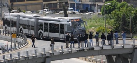 Topkapı Metrobüs üst geçidindeki çöplerde başlayan yangın, plastik korkulukların da alev alev yanmasına neden oldu. İtfaiye, yangını suyla söndüremeyince köpük sıkmak zorunda kaldı. Sıkılan köpük ve yola düşen parçalar nedeniyle D-100 karayolunda seyreden sürücüler, tehlike atlattı. Topkapı Metrobüs üst geçidine bırakılan çöpler, saat 01.00 sularında yanmaya başladı. Çöplerde başlayan yangın, üst geçidin plastik korkuluklarına da sıçradı. Yangını gören vatandaşlar durumu hemen itfaiyeye haber verdi. Olay yerine gelen itfaiye ekipleri, yangını önce su sıkarak söndürmeye çalıştı. Yangın suyla sönmeyince köpük sıkıldı. Bu sırada D-100 karayolu Atatürk Havalimanı yönüne seyreden sürücüler, yola dökülen köpük ve parçalar nedeniyle büyük tehlike atlattı. Olay yerine gelen polis ekipleri de, gerekli tedbirler alınmadan köpük sıkan itfaiye ekiplerine tepki gösterdi. Polisin uyarısı üzerine, itfaiye yoldaki köpüğü temizledi. Şans eseri herhangi bir kaza meydana gelmedi. Yangın nedeniyle metrobüs seferleri kısa süre gecikmeli yapılabildi. Yangın nedeniyle üst geçitte maddi hasar meydana geldi. |