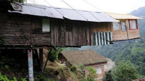 benzeri bulunmayan çelik halatlarla asılı ev, arazinin alt tarafındaki evlerin