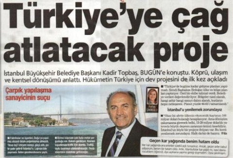 p>İstanbul Büyükşehir Belediye Başkanı Kadir Topbaş, Bugün Gazetesi’nden Perihan Çakıroğlu’na verdiği röportajda Türkiye ve İstanbul için düşünülen projeleri açıkladı. Başbakan Erdoğan’ın Türkiye’nin ülke ve bölge planlarının yapılması için özel bir ekibi görevlendirdiğini belirten Topbaş, çalışmanın Türkiye’ye çağ atlatacağını söyledi. Çalışmayla hangi şehrin nasıl planlanacağını, hangi sanayi dalının nerede olacağını ve şehirlerin hangi özellileriyle öne çıkacağının belirleneceğini ifade eden Başkan Kadir Topbaş, “Türkiye’nin bugüne kadar gelişme planları yapılmadı. Ülke planlarında şehirler için gerekli fonksiyonları koyarsanız, ne yapılması gerektiği de daha iyi ortaya çıkar. Başbakanımızın talimatıyla başlatılan çalışmayla yüzde 5’lerde olan ülke planlama çalışması şu anda yüzde 65’lere yükseldi. Bizim elimizdeki verilerin de dikkate alındığı çalışmayla ülkemizin şehirlerinin ve bölgelerinin hangi özellikleriyle ön plana çıkarılacağı, hangi şehirde hangi sanayi dalının olacağı belirlenmiş olacak. Bu verimliliği arttıracak” diye konuştu.