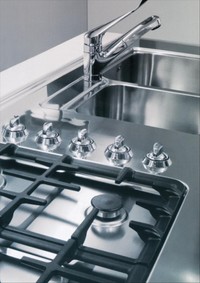 geliyor. Evye, ocak ve tezgahı bir çelik düzlem içinde birleştiren tam