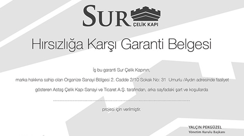 “Dünyanın en güvenli kapısı” sloganıyla yola çıkan Sur Çelik Kapı hırsızlığa karşı garanti sertifikası veriyor. Firma, eğer kapıları zorlama, darbe ve kuvvet uygulanarak yapılan müdahaleler sonucu açılırsa tazminat ödeme garantisi veriyor.