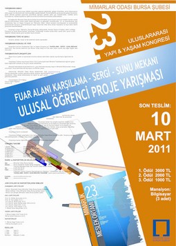 Sürdürülebilir çevre oluşum sürecine meslek insanları olarak katkıda bulunulmasını temel hedef olarak gören Mimarlar Odası Bursa Şubesi; "23. Uluslararası Yapı ve Yaşam Kongresi" için, Mimarlar Odası’nın sürdürebilirlik çerçevesindeki duruşunu anlamlandıracak özgün tasarımlar elde etme amacıyla Karşılama ve Kayıt Kabul Standı temalı bir yarışma